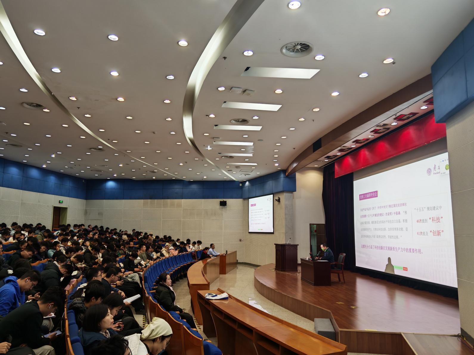 11月27日,南开大学副校长白承铭以“深入学习贯彻党的二十届四中全会精神 加快高水平科技自立自强 引领发展新质生产力”为题,为数学科学学院、统计与数据科学学院、软件学院全体本科生讲授“形势与政策”课,三院师生以线上、线下相结合的方式参加本次课程学习。